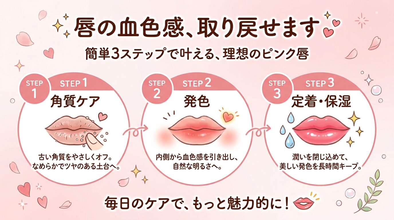 唇の血色感を取り戻すための3つのポイントをご紹介します。